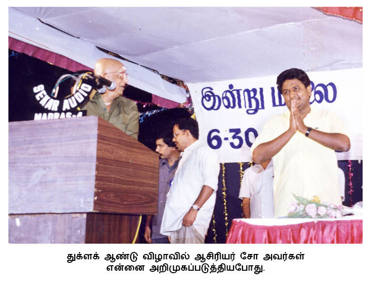 ஆனால், தன்னைச் சுற்றியுள்ளவர்களைப் பெருமைப்படுத்துவதில் அவர் மகிழ்ச்சி அடைந்தார்! ஒவ்வொரு ‘துக்ளக்’ ஆண்டு விழாவிலும் அவரது அலுவலக ஊழியர்களை அறிமுகப்படுத்துவதை வழக்கமாகவே கொண்டிருந்தார்! 1995, 96 காலகட்டத்தில் அ.தி.மு.க ஆட்சியைத் தீவிரமாக எதிர்த்து, தலையங்கங்களும், கார்ட்டூன்களும் துக்ளக்கில் வெளிவந்துகொண்டிருந்த நேரம். அ.தி.மு.கவினர்கூட இதை எதிர்த்தார்களோ இல்லையோ, ஆனால் துக்ளக் வாசகர்கள் பெரும்பாலோரிடம் இருந்து எதிர்க் கருத்துகள் வந்துகொண்டிருந்த நேரம்! (எந்தக் காரணமிருந்தாலும் சரி, கருணாநிதியையும் தி.மு.க வையும் சோ ஆதரிப்பதை அவர்களில் பலர் விரும்பவில்லை!)