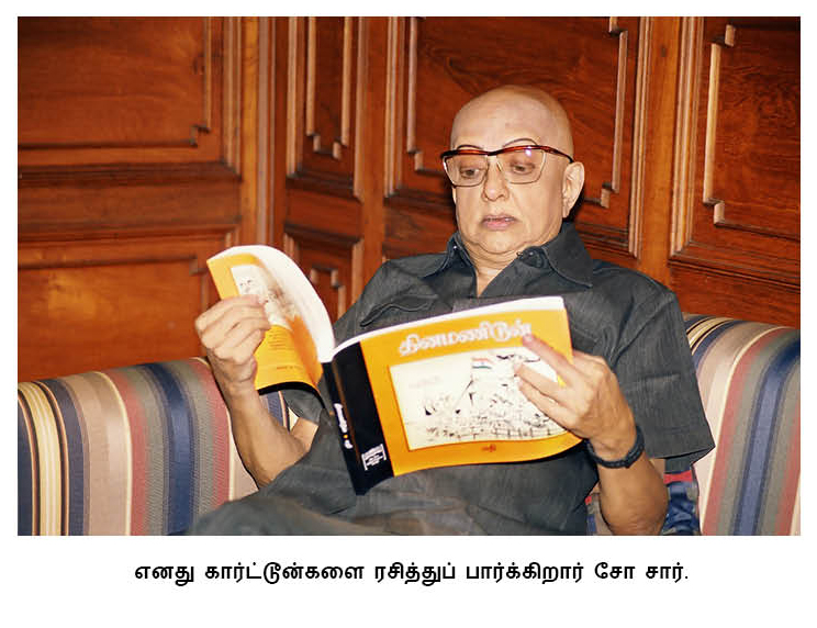 வியக்கச் செய்தது அவரது பெருந்தன்மை! ஒருவனால் தனக்கு இனி பிரயோஜனம் இல்லை என்று தெரிந்து விட்டால் திரும்பிக்கூட அவனைப் பார்க்க விரும்பாத காலம் இது. ஆனால், நான் துக்ளக்கில் இருந்து விலகிய பிறகும் தனது நண்பர்கள் ஐந்து பேரோடு எனது திருமணத்திற்கு வந்து சிறப்புச் செய்தார். எனது கார்ட்டூன்களின் முதல் தொகுப்பான ‘தினமணிடூன்’ – புத்தகத்தை ஆகஸ்ட், 2013 தி நியூ இந்தியன் எக்ஸ்பிரஸ் குழுமமே கொண்டு வந்தது. அதை சோ சாரை வைத்தே வெளியிட்டுப் பெருமை அடைந்தேன்.