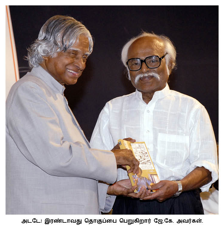 ஆனால் நான் கேட்ட கேள்விகளுக்கு அவரிடமிருந்து பதில்கள் spontaneous –ஆக வந்து விழுந்தது. ATM –ல் பணம் எடுப்பதாக இருந்தாலும் அட்டையைச் சொருகிய பிறகு PIN No. உட்பட ஏழெட்டுப் பொத்தான்களை அமுக்கிய பின்தான் பணம் வரும்! ஆனால் card swipe செய்ததுமே நாம் நினைக்கும் தொகை அப்படியே வந்து விழுந்தால், எப்படியிருக்கும்?! அதுபோலத்தான் அவரிடமிருந்து பதில்கள் வந்தன! அவருடைய உலகியல் ஞானத்தைப் பற்றி, அது தரும் பதில்களின் வேகத்தைப் பற்றிச் சொல்வதாக இருந்தால் ஜே.கே-வைப் பற்றி இப்படிச் சொல்லலாம். அவர் ஓர் ATA – ‘Any Time Answer’!