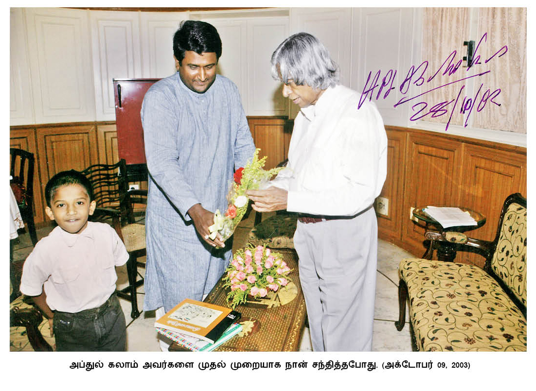 அக்டோபர் 9-2003 அன்று சென்னை ஆளுநர் மாளிகையில் அப்துல் கலாம் அவர்களை முதன்முறையாகச் சந்திக்கும் வாய்ப்பு கிடைத்தது. அவர் அறையின் உள்ளே நுழைந்தும், என்னைப் பார்த்து கைகொடுத்தவர் என்னிடம் பேசுவதற்கு முன்பே, எனது பையனைப் பார்த்து (அப்போது அவன் 1-ம் வகுப்பு அல்லது 2–ம் வகுப்பு படித்துக்கொண்டிருந்தான் என்று நினைக்கிறேன்) ‘‘என்னடா, எப்படி இருக்கறே? என்ன படிக்கறே?’’ –எளிய மிக மென்மையான குரலில் கேட்டார்.
