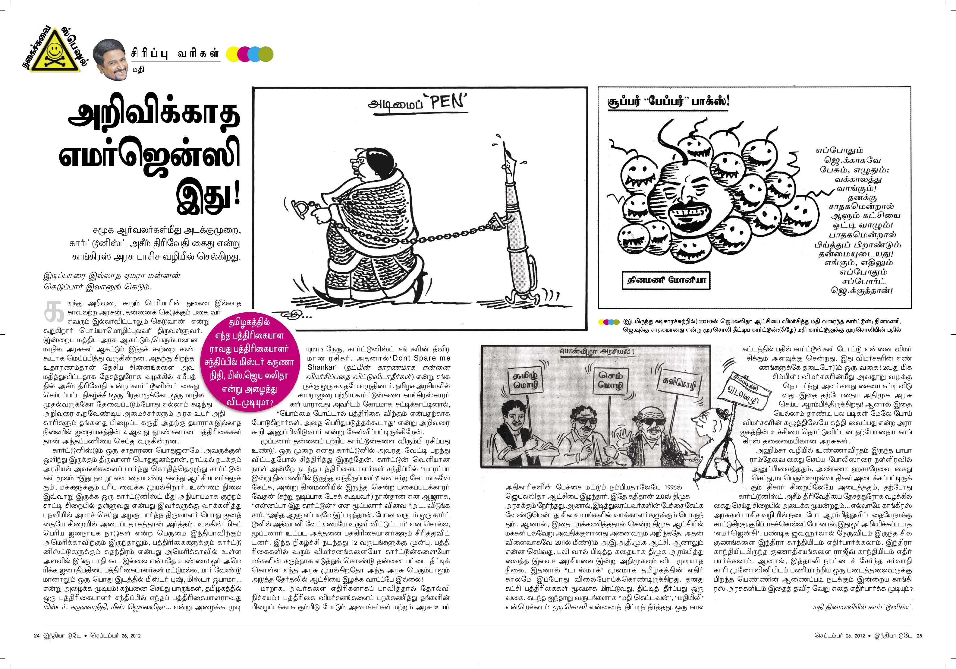 குறிப்பாகச் சொல்லப் போனால், இது ஓர் அறிவிக்கப்படாத ‘எமர்ஜென்சி’. பண்டித ஜவாஹர்லால் நேருவிடம் இருந்த சில குணங்களை இந்திரா காந்தியிடம் எதிர்பார்க்கலாம். இந்திரா காந்தியிடமிருந்த குணாதிசயங்களை ராஜீவ் காந்தியிடம் எதிர்பார்க்கலாம். ஆனால், இத்தாலி நாட்டைச் சேர்ந்த சர்வாதிகாரி முசோலினியிடம் பணியாற்றிய ஒரு படைத்தலைவருக்கு பிறந்த பெண்ணின் ஆணைப்படி நடக்கும் இன்றைய காங்கிரஸ் அரசுகளிடம் இதைத் தவிர வேறு எதை எதிர்பார்க்க முடியும்?!