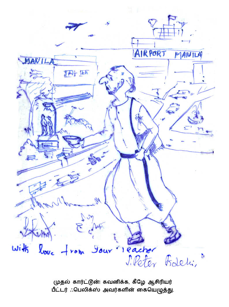அப்போது ஃபாதர் ஜோசப் ஃபெலிக்ஸ் அவர்கள் ஒரு மாதப் பயணமாக பிலிப்பைன்ஸ் தலைநகர் மணிலாவுக்குச் சென்றிருந்தார். எங்களுக்கு அந்நாளில் ஒருவர் வெளிநாடு செல்வது என்பது பெரிய விஷயம். அதனால் நண்பர்களுக்குள் ஒரு விவாதம். ‘‘இவர் எதற்கு திடீர்னு பிலிப்பைன்ஸ் போறாரு?” நான் கேட்ட கேள்விக்கு “இதோ பாரு, இந்த ஸ்கூல் நூற்றாண்டு கண்டுவிட்டது. பிரிட்டிஷ்காரன் கட்டிக் கொடுத்துட்டுப் போயிட்டான். அவற்றில் பாதி பில்டிங் இன்னும் ஓட்டுக் கட்டிடங்களாகவே உள்ளன! பள்ளியை இன்னும் பெருசா டெவலப் பண்ண வேண்டாமா? அதற்கு நிதி வேண்டாமா? இப்படியெல்லாம் வெளிநாடு போனாதான் அது சாத்தியமாகும்! அதற்காகத்தான் போறாரோ என்னவோ?” என்று நண்பன் ஒருவன் அவனுக்குத் தோன்றியதைச் சொன்னான்! அன்றே விளையாட்டாக எனது நோட்டில் வரைந்த கார்ட்டூன்தான் அது!